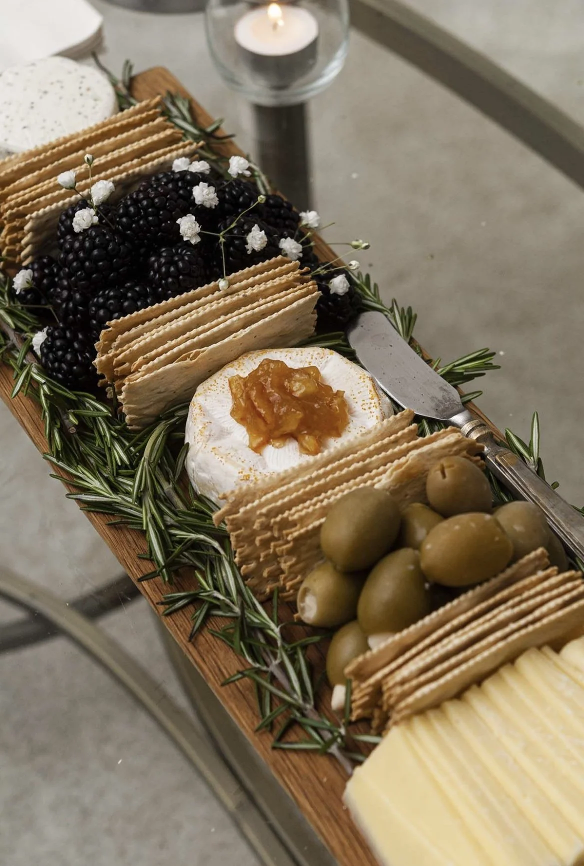 Lage vakre fat med pepperkaker, ost, vindruer, klementiner og pæreskiver